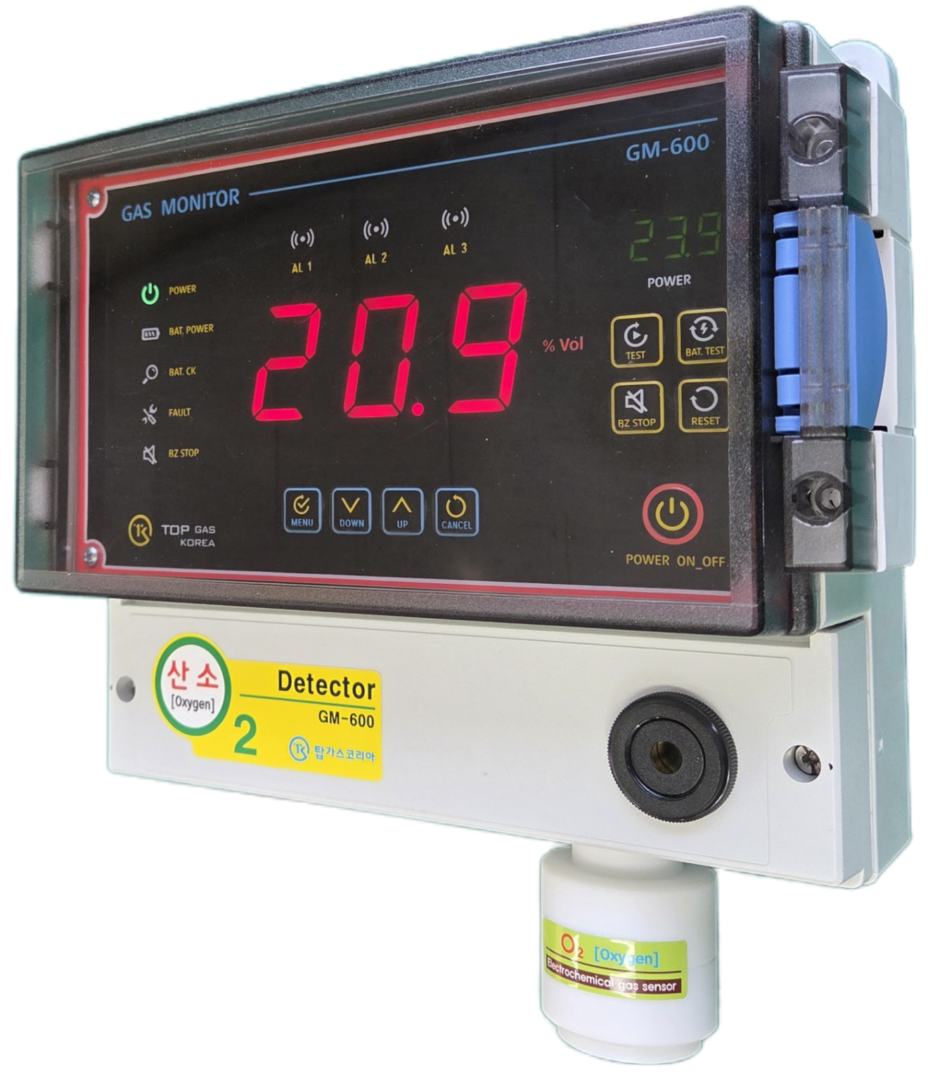 | 산소를 측정하여 농도를 표시하고, 감지 신호를 Analog 4~20mA 표준출력 신호를 제공하는 일체형 가스감지기 입니다. 표준출력 신호는 컨트롤러등에 전송되어 가스모니터링 시스템을 구성할 수 있습니다. |